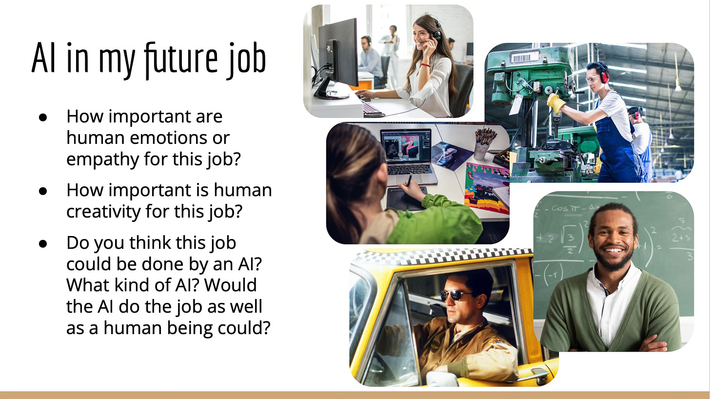 This activity encourages students to consider the potential impacts of AI on different professions, both at present and in the future. It also makes them think critically about the human qualities and skills that are difficult for AI to replicate.