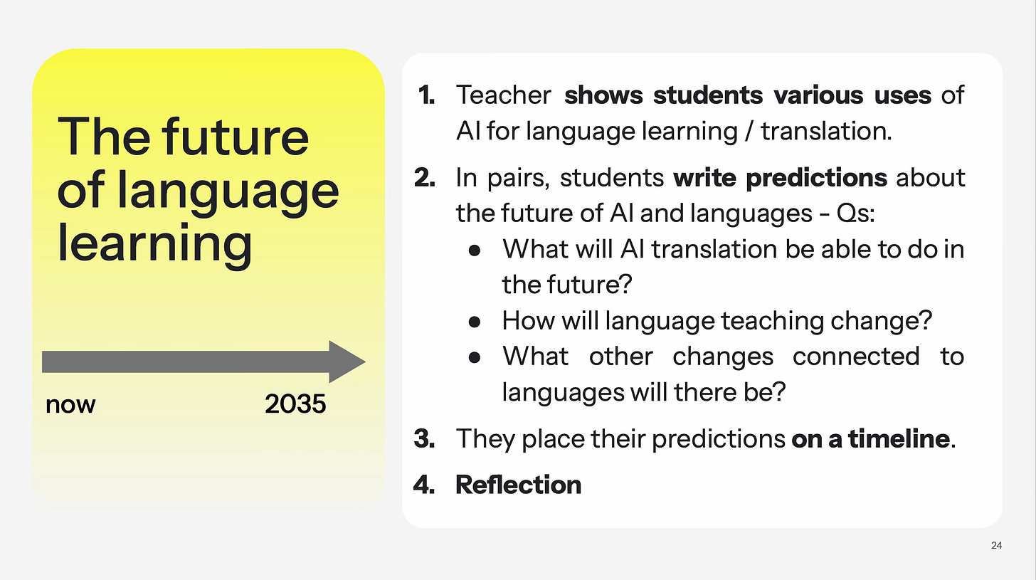 In this activity, students are encouraged to consider how AI may one day shape fields like translation, language teaching, and language-related careers. It also invites students to reflect on why, even in this context, human language skills remain valuable tools.