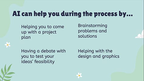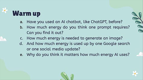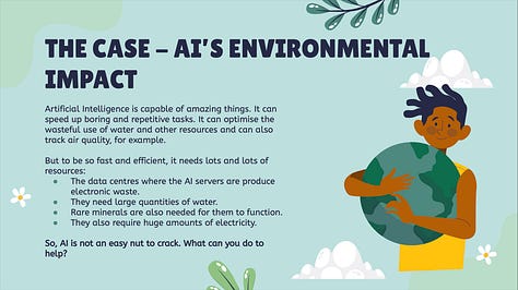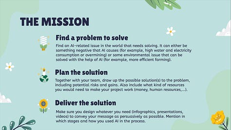 So, let’s see this project task from our book (chapter 5.4, p. 89). The idea is that we ask students to do some research in teams to see either how AI technology can save the planet (by optimising farming, for example) or how it destroys the planet and whether there’s a way to stop it.