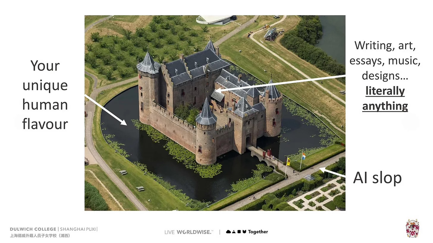 Alapvetően a vizesárok azokat az egyedi emberi tulajdonságokat szimbolizálja, amelyek megkülönböztetnek a többiektől és pótolhatatlanná tesznek az MI moslékkal szemben. Ezt az erős moslék szót nem én találtam ki, az eredeti AI slop volt az Oxford szótár 2024-es Év Szava versenyének egyik döntőse (majd 2025-ben a Merriam-Webster szótár Év Szava). Az MI moslék vagy MI szemét olyan generált tartalmat (szöveg, kép, videó, zene) jelent, ami nem hordoz semmilyen mögöttes tartalmat vagy értéket, hibás, vagy alacsony minőségű.