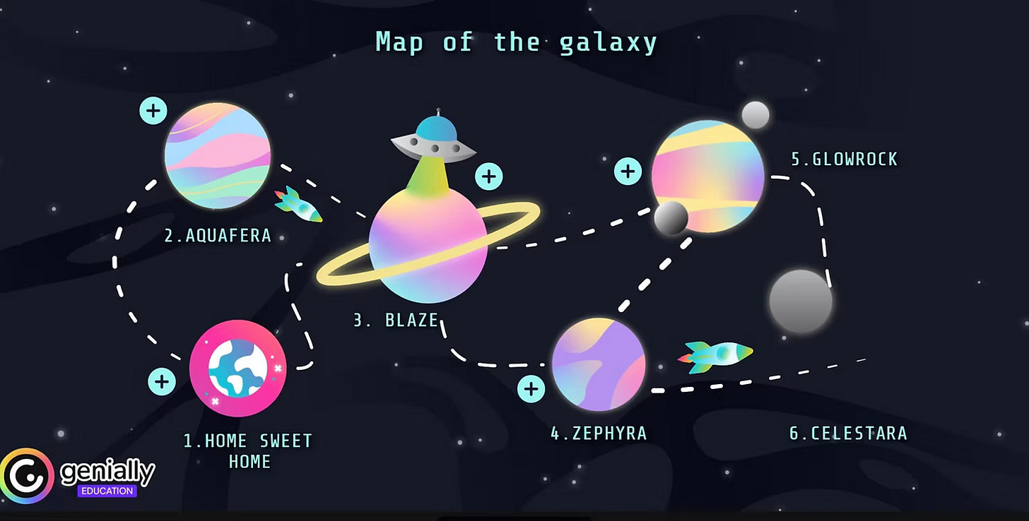Először is, kiválasztottam a Genially sablont. Egy 5 bolygót tartalmazó űrtérképet választottam. A képen nem változtattam semmit.