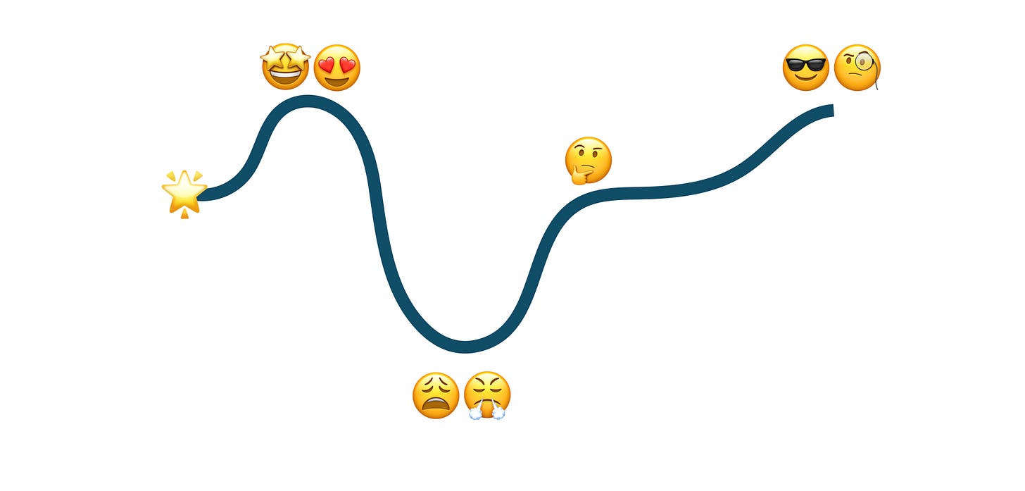Our relationship with new experiences has been described by several researchers, and they seem to follow a similar pattern. Oberg’s original four stages of culture shock (honeymoon, anxiety / frustration, adjustment, acceptance) or Gartner’s hype cycle (innovation (trigger), peak of inflated expectations, trough of disillusionment, slope of enlightenment, plateau of productivity) are some of the most famous ones out there.