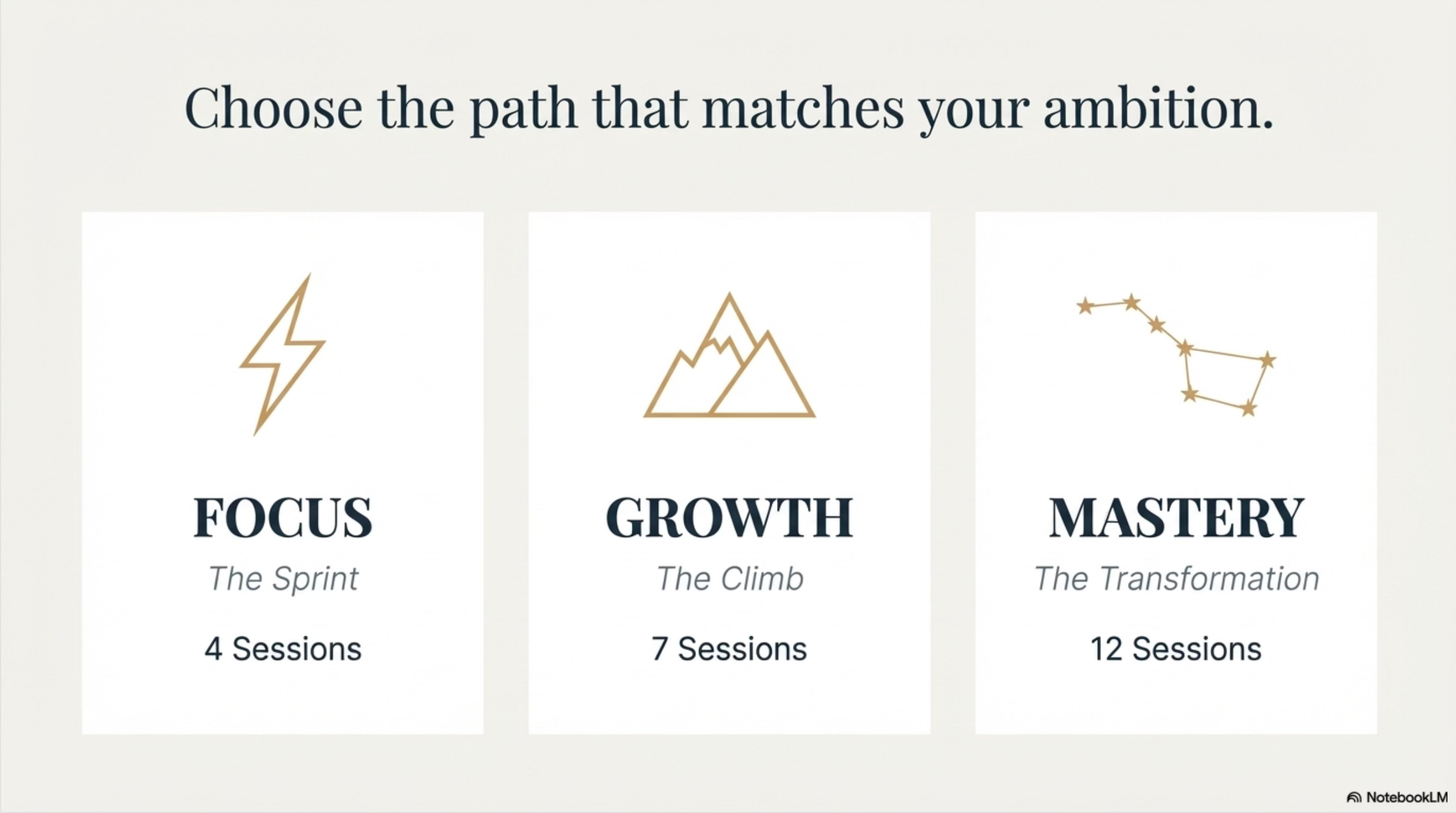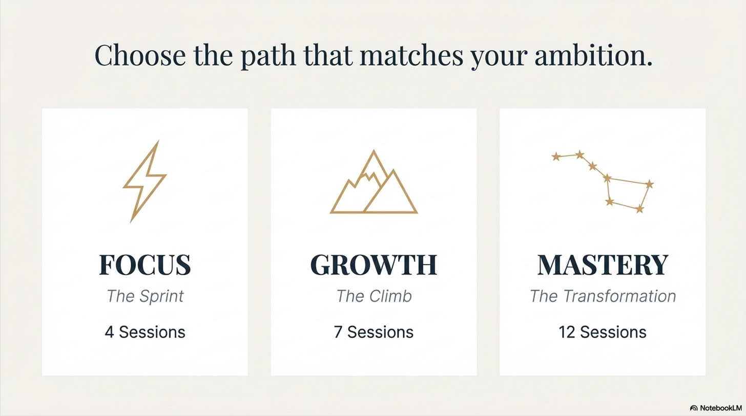 The Transformation. A total reconstruction of your professional identity in English. We cover advanced storytelling, complex negotiation, and leadership psychology.