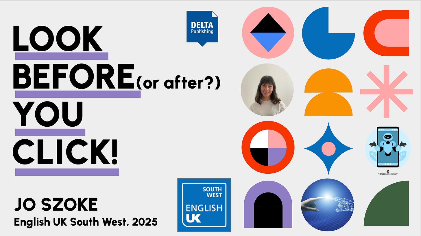 AI Literacy in the Language ClassroomLook Before You ClickI had the honor to do the plenary talk at the English UK South West Annual Conference in Bristol this November. Check out my slides, including some great AI literacy activites.Jo SzokeNov 16, 20251ShareClick here to view the slidesDownload them as a PDFThanks for reading Short and Simple English! Subscribe for free to receive new posts and support my work.Subscribe
