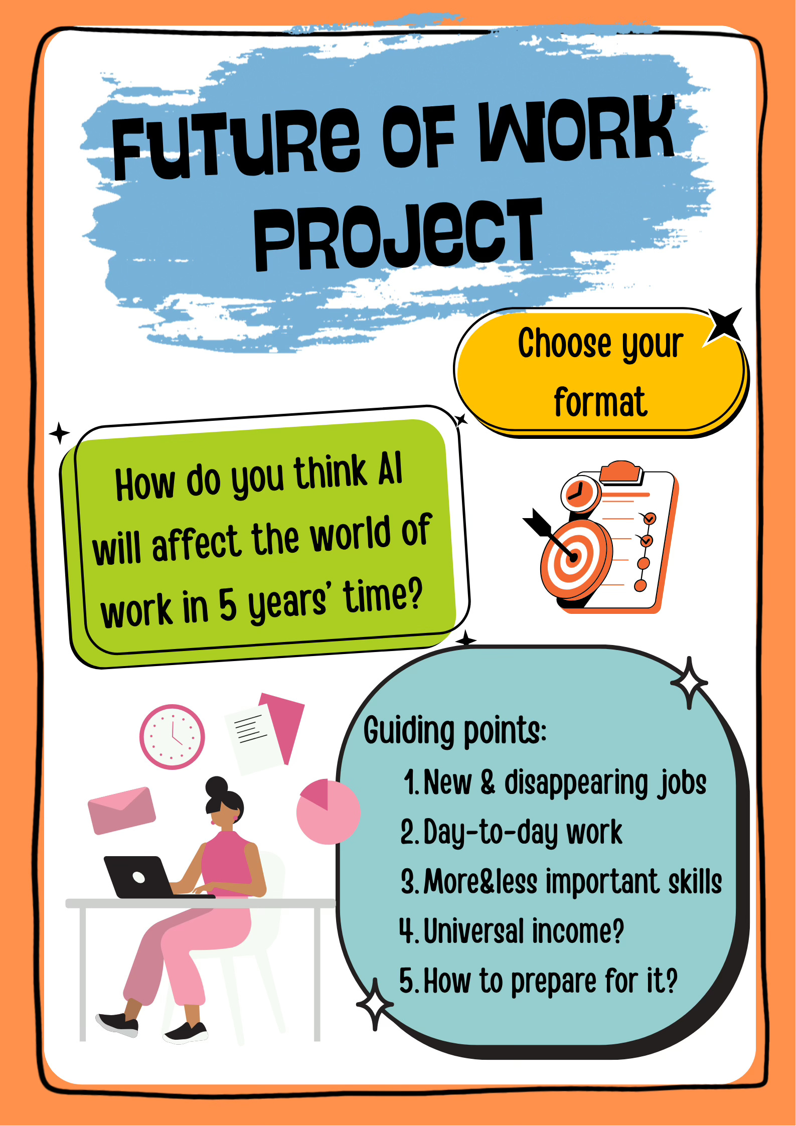 In this project task, students work together in groups to do some research on how AI is going to affect future professions and the way we work. Some guiding questions they can follow are: